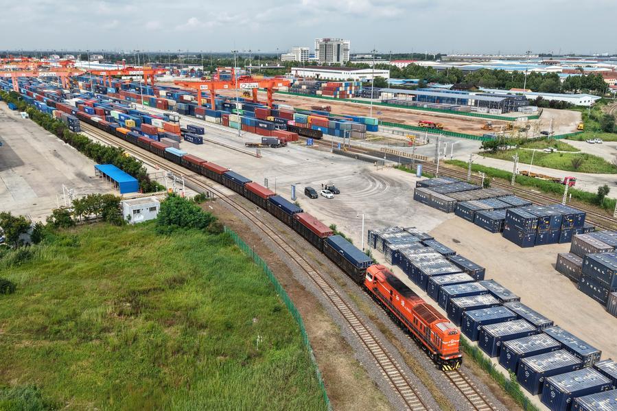 8月27日,一列貨運列車駛?cè)胛挥谏虾鲜痉秴^(qū)內(nèi)的中國-上海合作組織地方經(jīng)貿(mào)合作示范區(qū)多式聯(lián)運中心(無人機照片)。新華社記者李紫恒攝